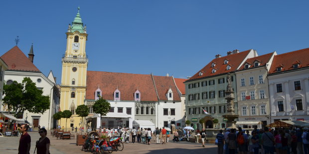Hlavné námestie auf deutsch der Hauptplatz ist ein sehr sehenswerter Platz in der Altstadt von Bratislava. Hier befindet sich das Alte Rathaus, in dem sich das Museum der Stadt befindet, der Roland Fountain, ein historischer Brunnen, ein Markt mit Souvenirs und zahlreiche Cafe´s in historischen Gebäuden.