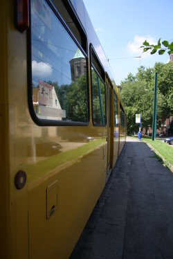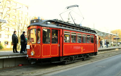 Umbau nach dem Krieg auf sechsfenstrigen Stahlaufbau (fünfziger Jahre!) gepolsterte Längssitze, Schleppdach